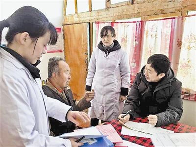 榆阳区中医医院院长谢磊(右一)正在为贫困户看病。